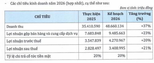 HĐQT đề xuất kế hoạch kinh doanh năm 2026 với doanh thu 48.660 tỷ đồng và lợi nhuận sau thuế 3.409 tỷ đồng, lần lượt tăng 37% và 21% so với thực hiện năm 2025. Bên cạnh đó là kế hoạch chia cổ tức tiền mặt tỷ lệ 20%.